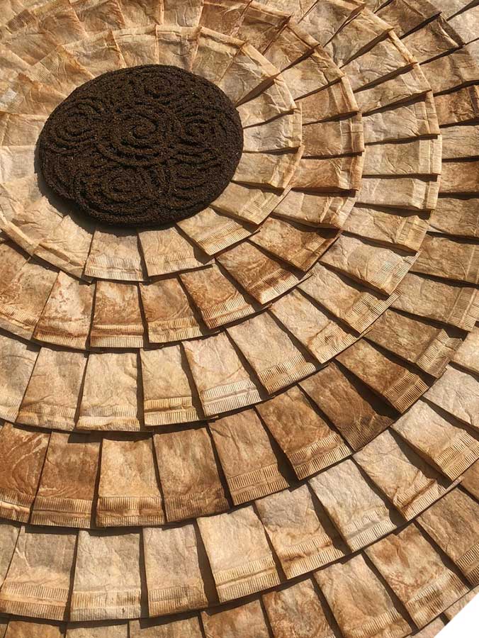 The irresistible reflection of light reaches out to draw you in. An imposing, shiny mandala to surprise and focus your attention. Take a closer look to discover what I am made from.